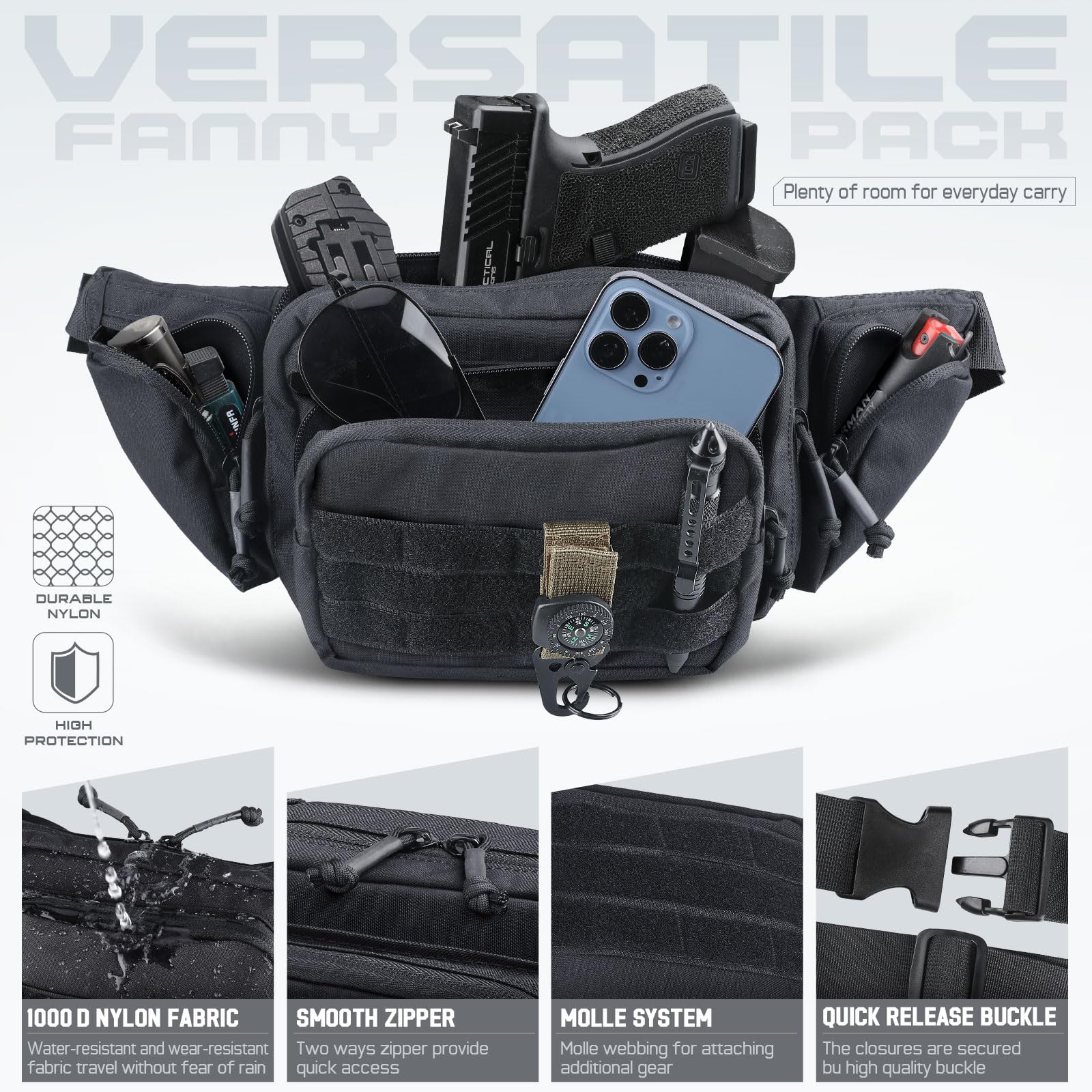 - Practical & Versatile: Waist pack features a zippered main pocket that includes two elastic straps to securely fasten the CCW, four elastic straps on the other side to hold pistol magazines, tactical knife, flashlight and other EDC tool. Men belt bag has a back zipper secure pocket for cash and cards. Two pockets on either side of the fanny pack for EDC tools.